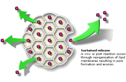 布比卡因脂質(zhì)體注射用懸浮液 Exparel的每一個(gè)微小囊泡都是由許多含有布比卡因的含水腔室及隔開(kāi)腔室的類脂雙分子層構(gòu)成。布比卡因多囊脂質(zhì)體其內(nèi)部結(jié)構(gòu)類似于“泡沫狀的矩陣”,含有布比卡因的水性腔室以非同心圓的形式構(gòu)成,每個(gè)腔室與相鄰的腔室通過(guò)磷脂膜分隔開(kāi),中性磷脂則填充在腔室的交匯處,起到穩(wěn)定結(jié)構(gòu)的作用。布比卡因多囊脂質(zhì)體內(nèi)部含有大量的水相,粒徑在24 ~ 31 μm,具有包封率高、包封體積大和滲漏率小等特點(diǎn)。