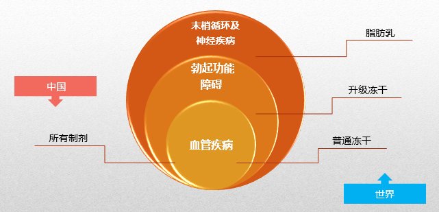 對比國內(nèi)外臨床上前列地爾注射液適應(yīng)癥的區(qū)別(下圖),其除了在血管疾病方面的應(yīng)用外,還可用于治療勃起功能障礙以及末梢循環(huán)和神經(jīng)疾病。能夠很明顯的感受到,前列地爾注射液具有相當(dāng)可觀的發(fā)展及利潤空間。