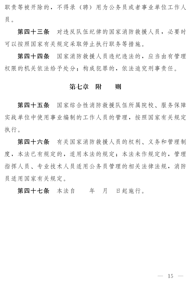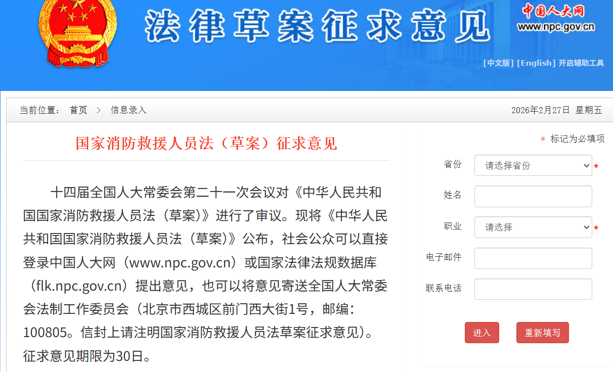 《中華人民共和國(guó) 消防救援人員法(草案)》已于2月27日公布,社會(huì)公眾可以直接登錄中國(guó)人大網(wǎng)或 法律法規(guī)數(shù)據(jù)庫(kù)提出意見(jiàn),也可以將意見(jiàn)寄送全國(guó)人大常委會(huì)法制工作委員會(huì)(北京市西城區(qū)前門(mén)西大街1號(hào),郵編:100805。信封上請(qǐng)注明 消防救援人員法草案征求意見(jiàn))。